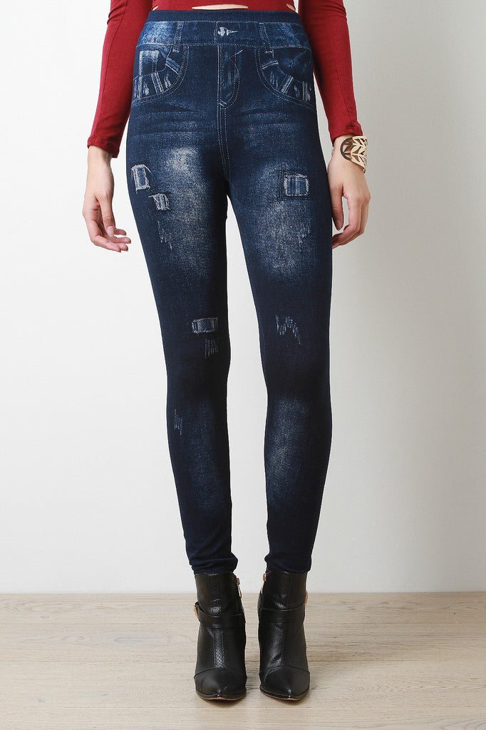 Distressed Denim Print High Waisted Leggings