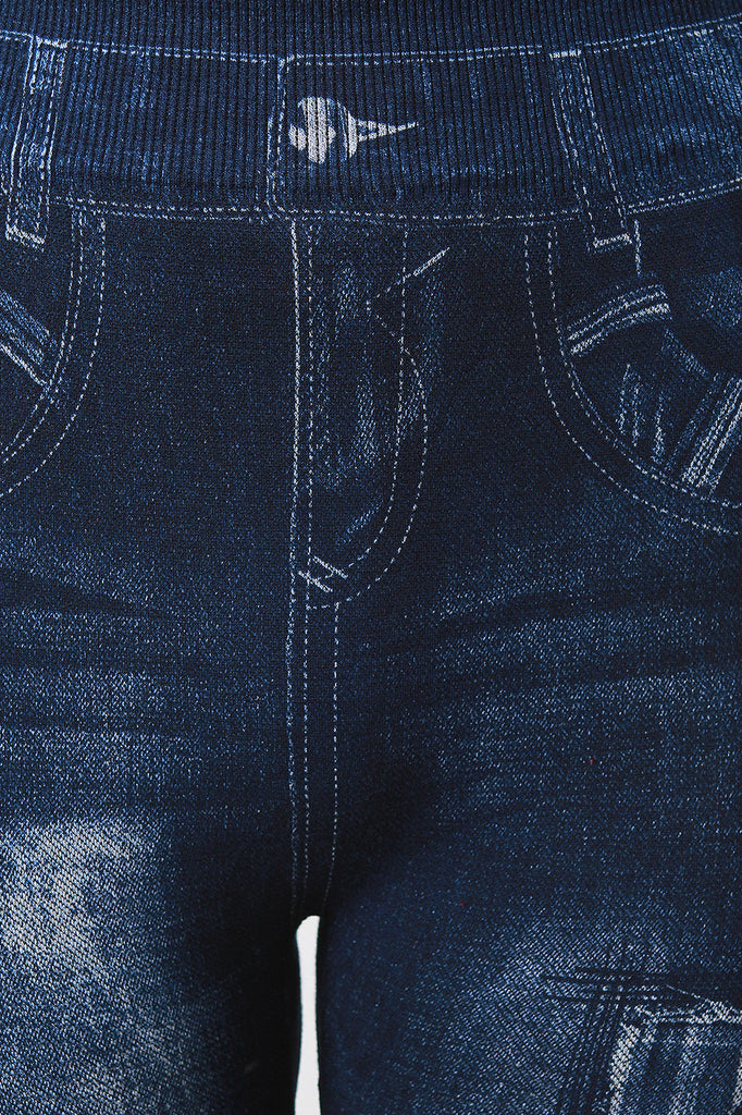 These leggings features a distress denim print fabrication, elasticized waist, and skinny taper cut legs. Accessories sold separately. 65% Cotton, 35% Polyester.