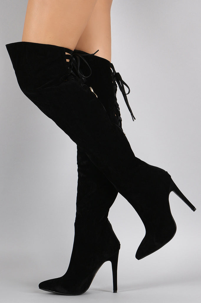 Suede Back Lace Up Pointy Toe Stiletto Over-The-Knee Boots