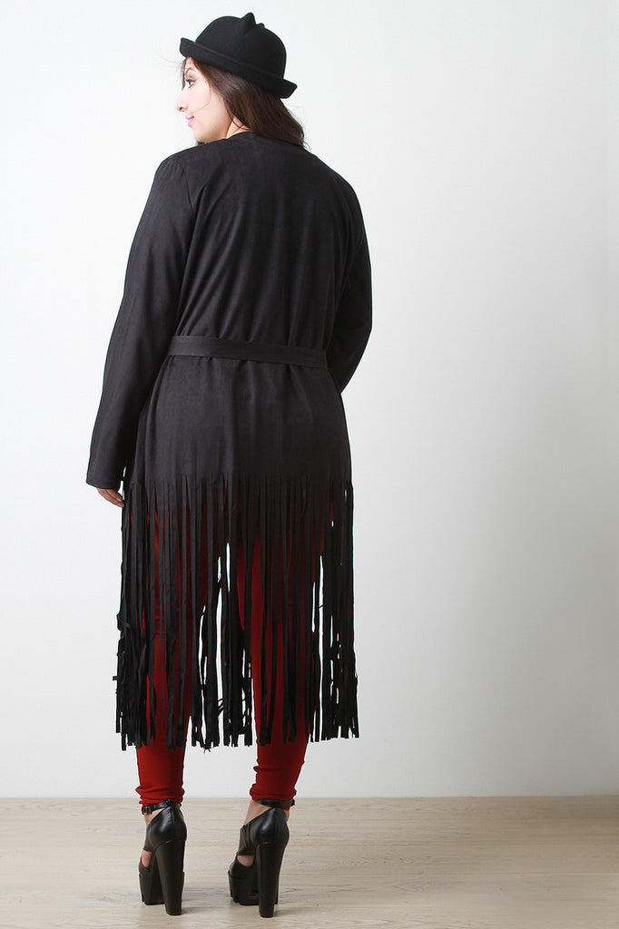 This vegan suede plus size trench coat features a draped open front design with self-tie sash, long sleeves, and fringe hemline. Accessories sold separately. 100% Polyester.
