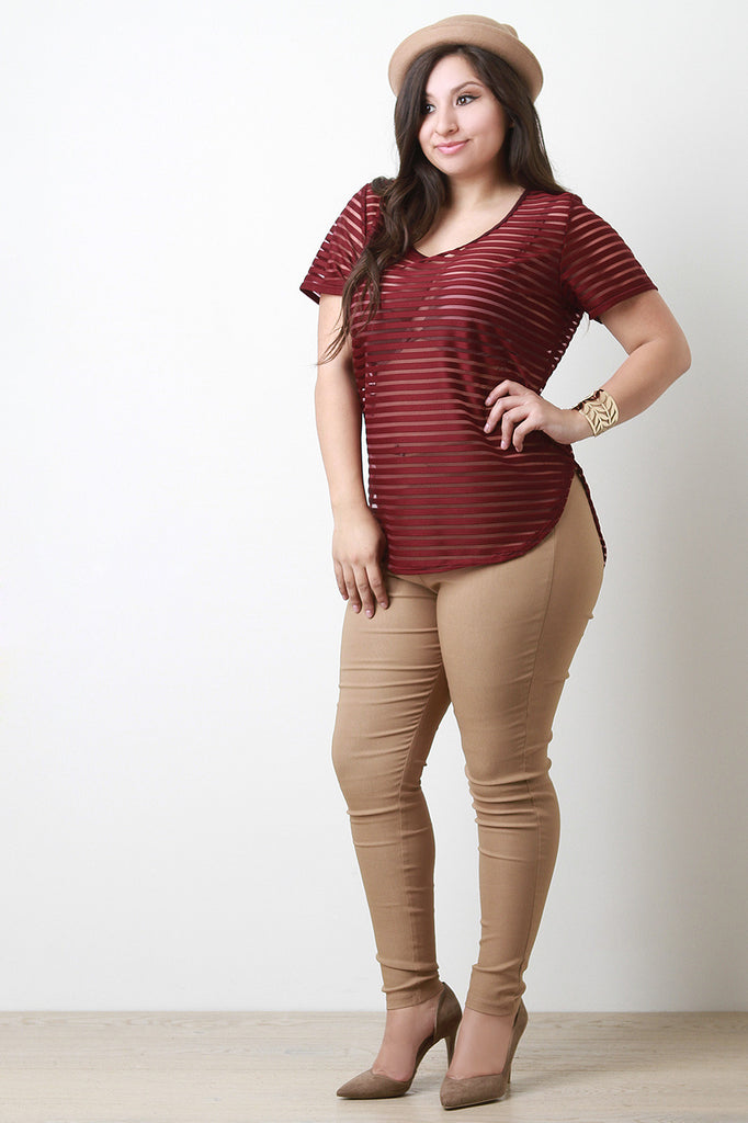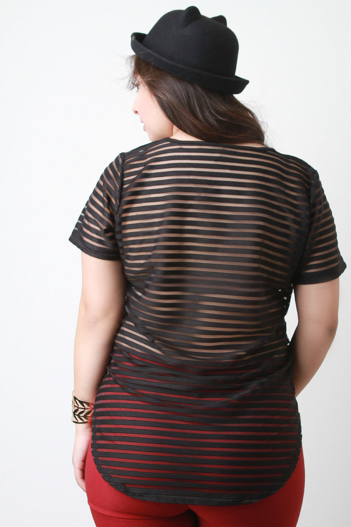 A plus size tee featuring ribbed stripes on semi-sheer mesh, a scooped round neckline, and short sleeves. Finished with a round hemline and side slits. Accessories sold separately. 97% Polyester, 3% Spandex.
