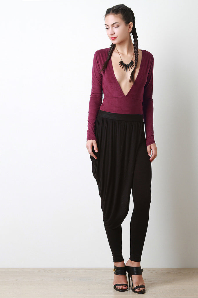 This bodysuit features vegan suede fabrication, long sleeves, plunging v-neckline, cinched waist seam, brief bottom and a double snap button closure at crotch. Accessories sold separately. Made in U.S.A. 90% Polyester, 10% Spandex.