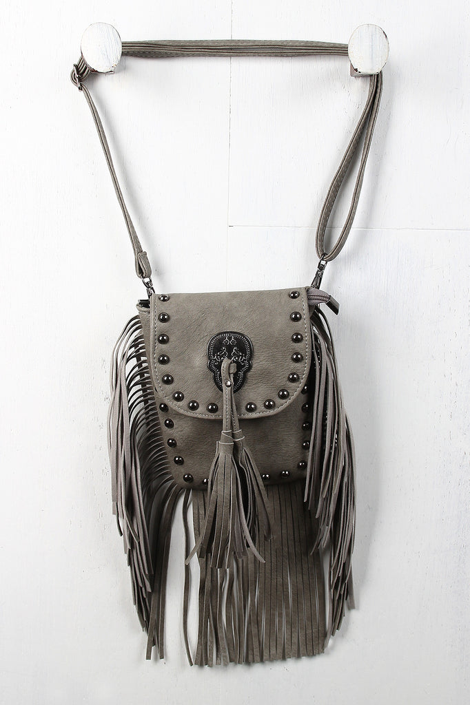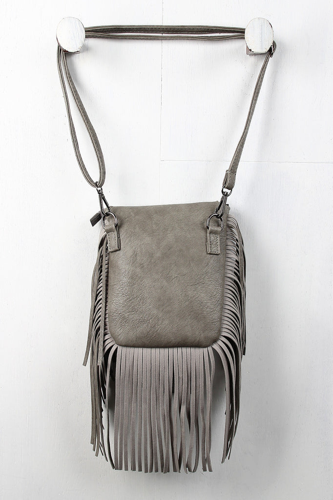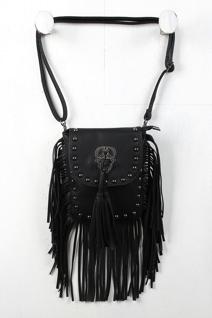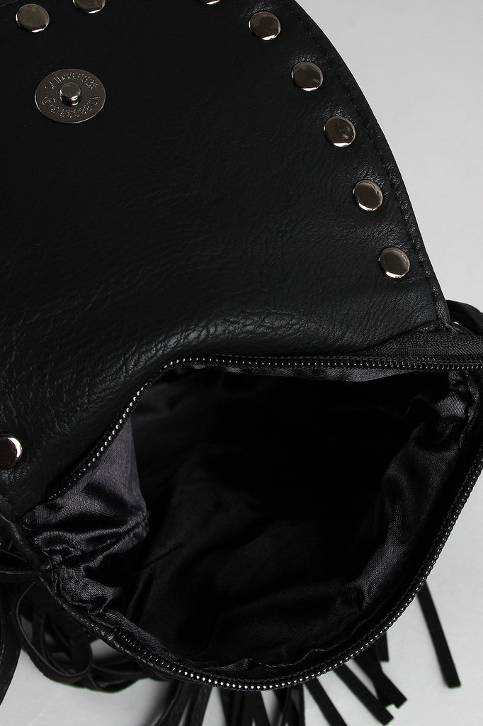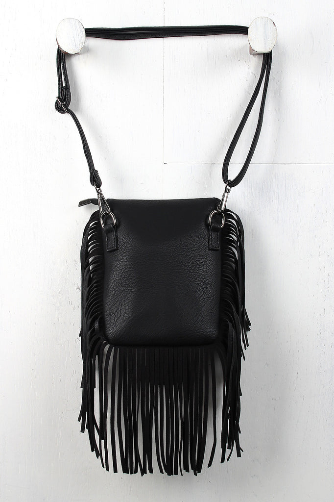 A vegan leather fringe trim. Also features satin interior lining and a magnet button and zipper closure. The adjustable shoulder strap attaches to the back of the bag with clips (12" drop).