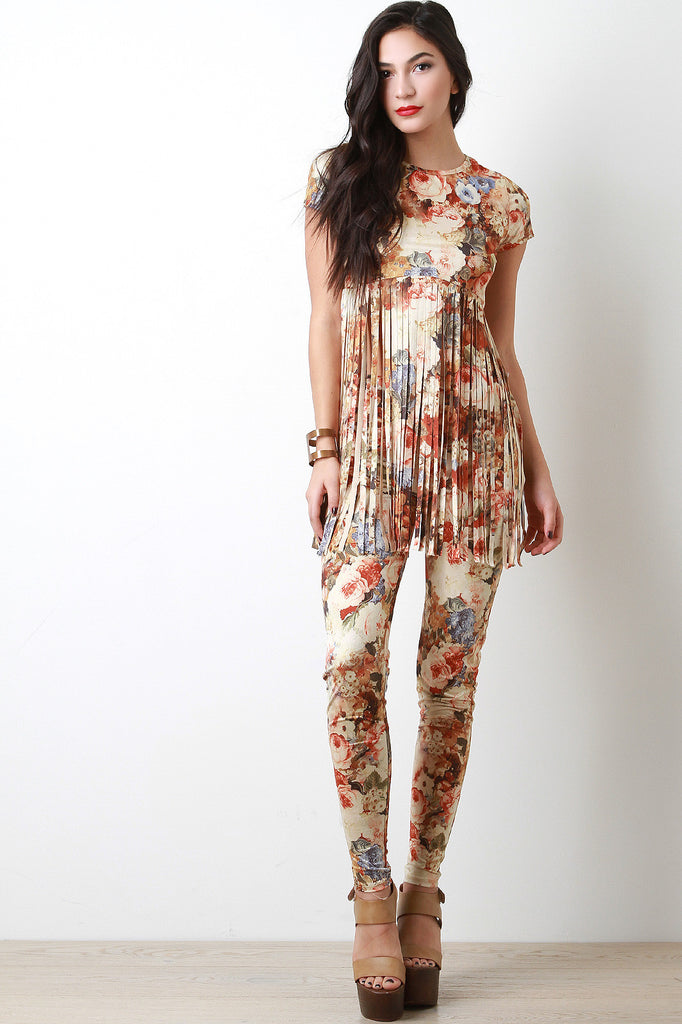 This soft microfiber top features floral print design, round neckline, short sleeves, and long cascading fringe hemline. Accessories sold separately. Made in U.S.A. 95% Polyester, 5% Spandex.