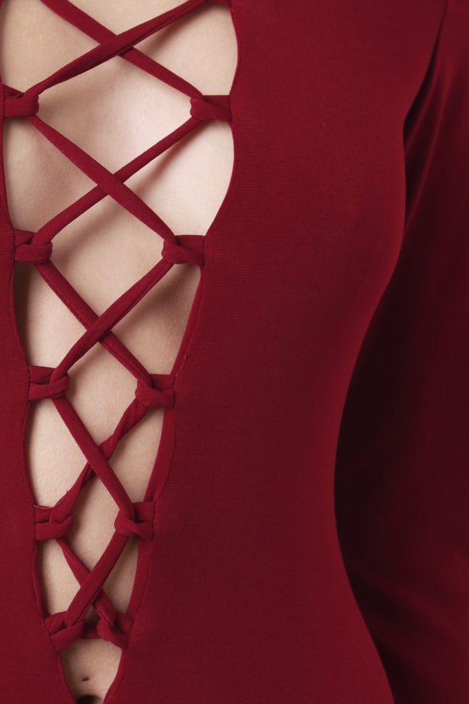 This trendy jumpsuit features stretch knit, corset lace front, long sleeves, and taper cut legs. Accessories sold separately. Made in U.S.A. 100% Polyester.