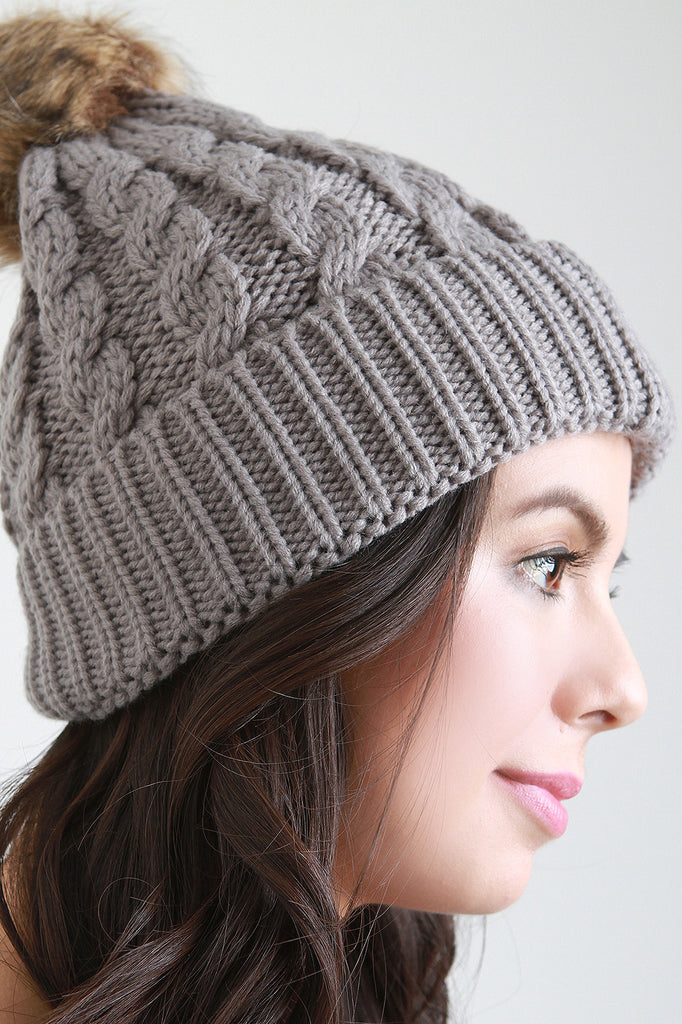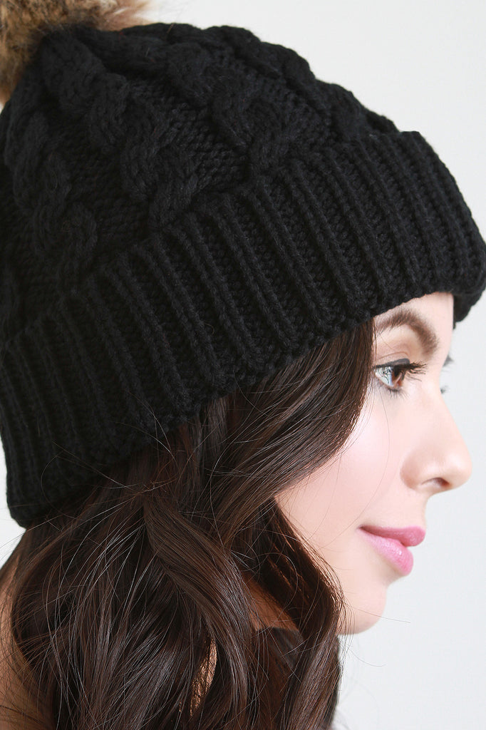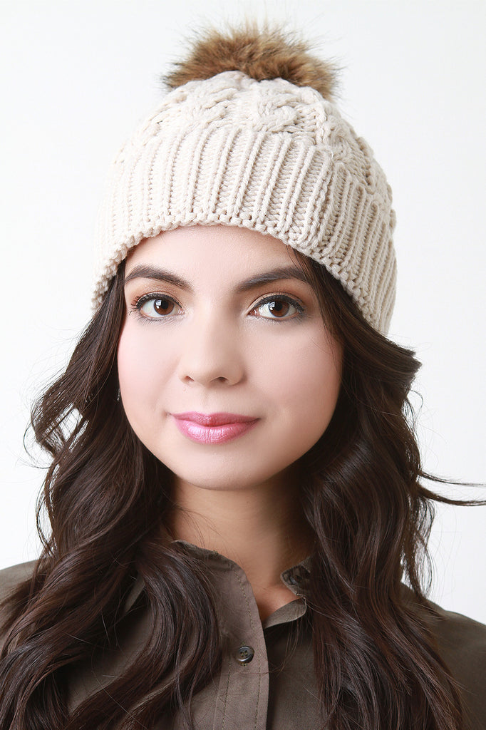 This beanie features a double weft knit fabrication with a ribbed knit flap. Has a faux fur, soft to the touch, pom on the top. 100% Acrylic.