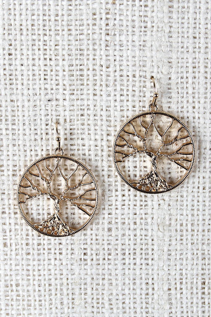 These glossy casting earrings feature a leaf-less tree design in a textured round frame with French hook backs.