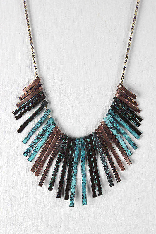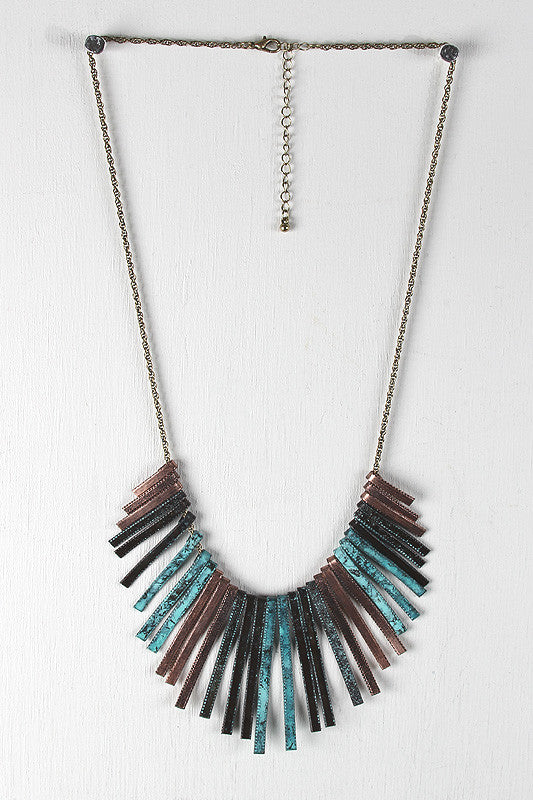 This necklace features a necklace with squared spikes painted over in an antique design. These sliding spikes have a layered design where the highest of the spikes are shorter than the lowest. Finished with a wheat necklace and a lobster hook for closure.