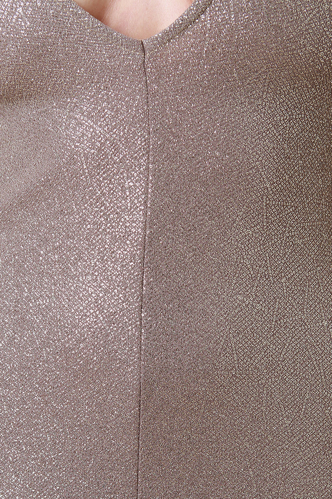 This midi dress features metallic knit, plunge neckline, long sleeves, midi length, and finished with front vent slit. Accessories sold separately. Made in U.S.A. 96% Polyester, 4% Spandex.