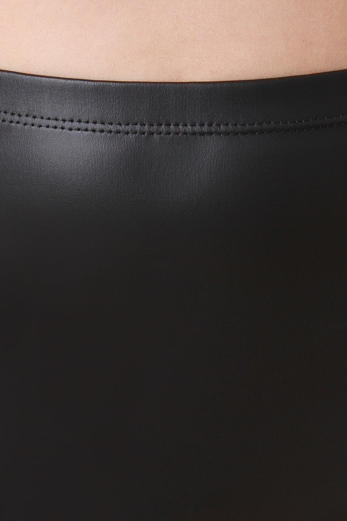 These hot shorts features a high waisted elasticized band, brief cut, and stretchy vegan leather fabrication. Accessories sold separately. Made in U.S.A. 95% Polyester, 6% Spandex.