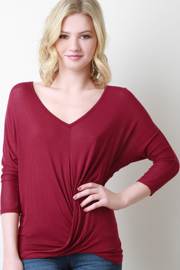 This knit top features v-neckline, long dolman sleeves, and twist accent. Accessories sold separately. Made in U.S.A. 97% Rayon, 3% Spandex.