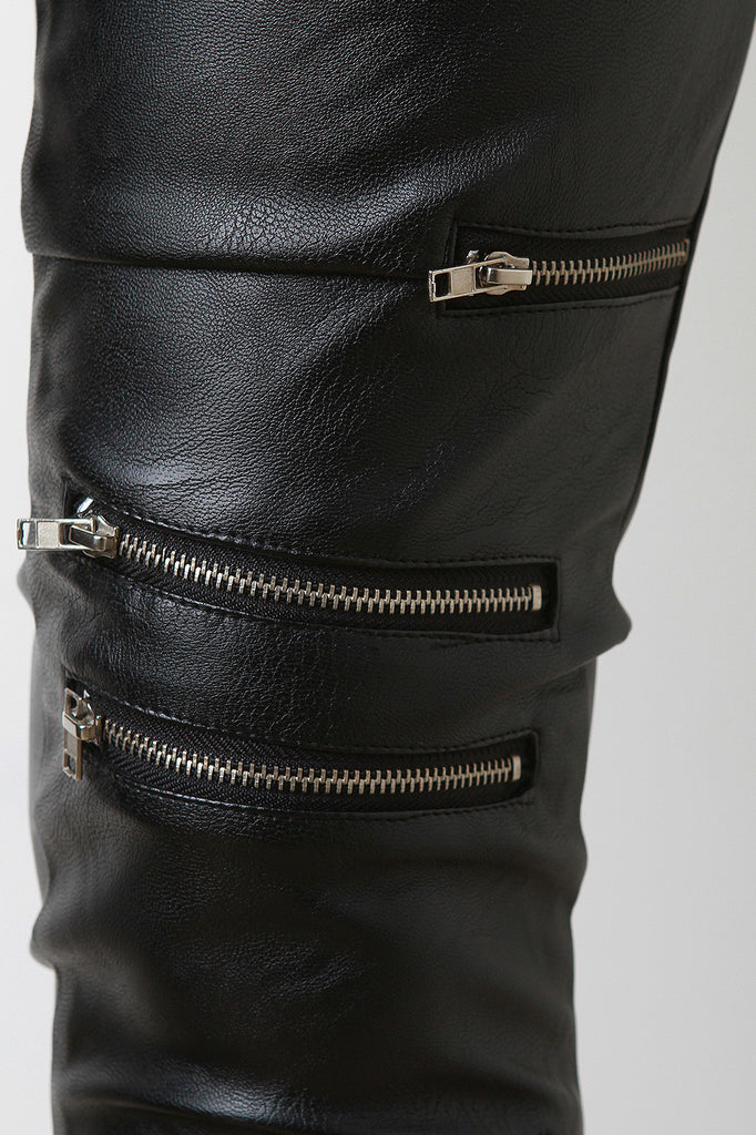 These vegan leather pants features a high rise waist, taper cut legs, classic 5-pockets design, belt loops, zipper fly, and zipper d�cor at knees. Accessories sold separately. 60% Pu, 40% Cotton.
