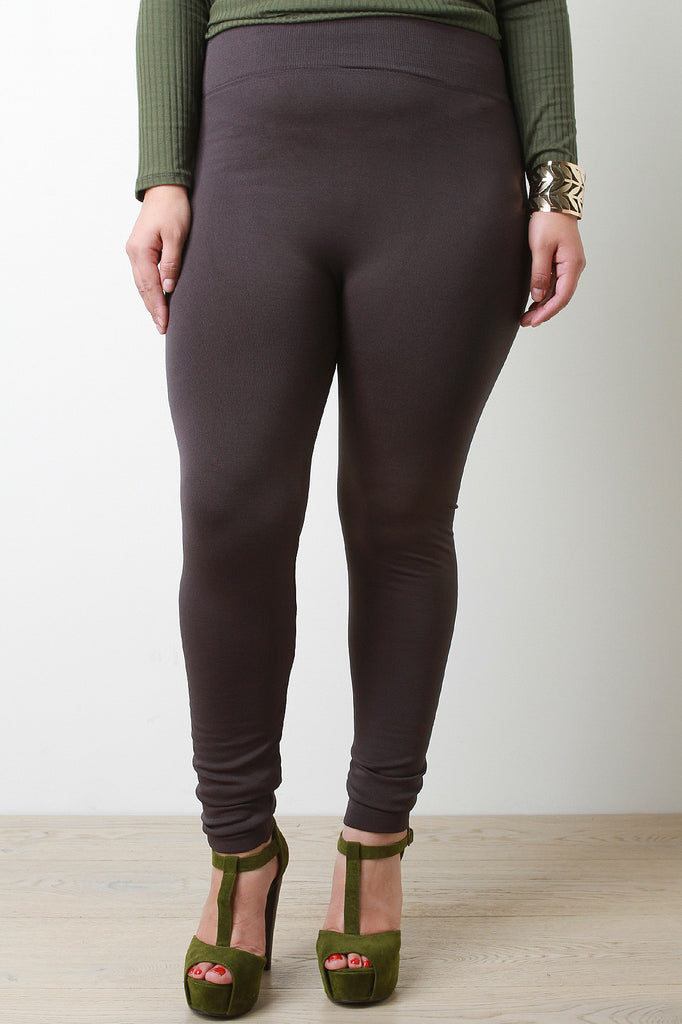 These plus size leggings features a smooth knit with plush fleece-like interior, wide elastic waistband, and solid seamless design. Accessories sold separately. 70% Polyester, 30% Spandex.