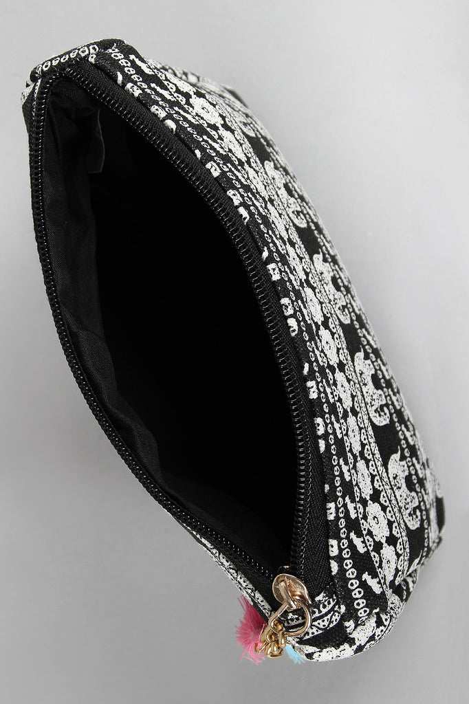 This monochrome elephant-patterned canvas pouch features a wider base and a tapered top, zipper closure with a double tassel zipper pull on a glossy curb link chain, and a lined interior.